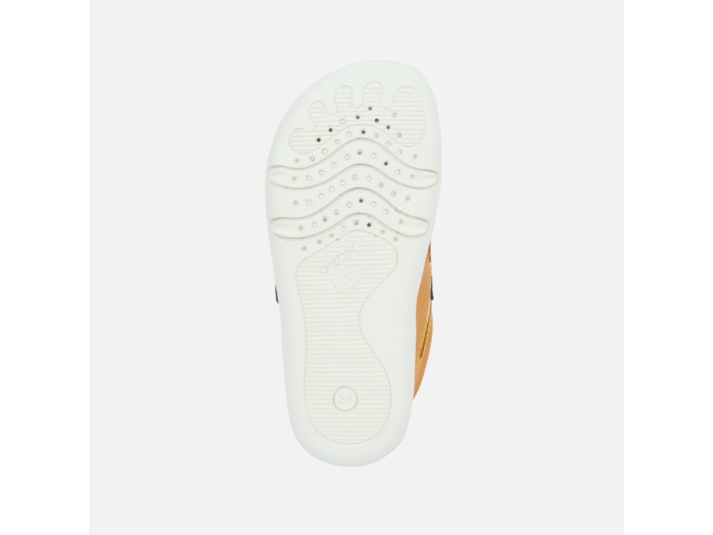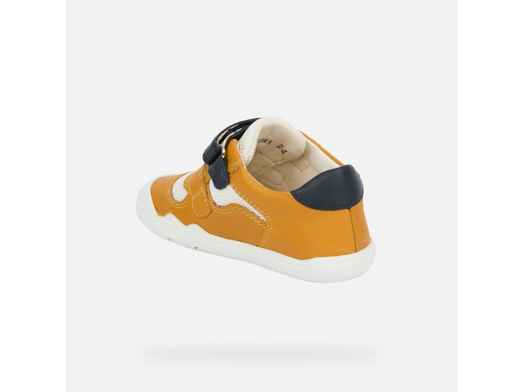 Celokožená obuv Geox v štýle barefoot. Topánky sú ľahké, s pevným opätkom a rozšírenou prstovou časťou s priedušnou podrážkou.